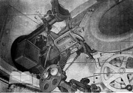 Экипаж 4 чел. Водитель и его помощник находились в отделении управления в передней части корпуса. Командир и заряжающий стояли на полу боевого отделения и были вынуждены передвигаться в соответствии с вращением башни, что было весьма непросто, учитывая проходивший через боевое отделение карданный вал. Интересно, что командир выполнял функции заряжающего и, кроме того, вращал башню по горизонтали! (Рис.5)