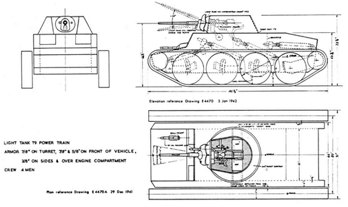 К апрелю 1942г. на Marmon-Herrington изготовили первый опытный образец лёгкого танка T9. Этот образец заметно отличался от макета. Клепаный корпус ушел в прошлое - корпус был собран теперь в основном при помощи сварки, только верхний лобовой лист крепился на болтах, чтобы обеспечить доступ к трансмиссии. Усилилось пулеметное вооружение – целых три пулемета Browning M1919: один спаренный с орудием и два в спарке в лобовом элементе корпуса. Стрелять из спарки лобовых пулеметов вменялось водителю, а перезаряжать их должен был заряжающий, сидящий в башне. (Рис.3)