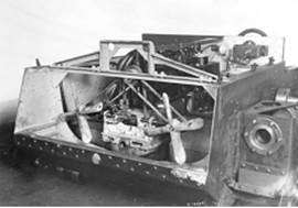 Бронировка моторного отделения осталась без изменений, новой разработкой была только защита боевого отсека, в котором могли размещаться два или три (?) танкиста. При этом, водитель располагался по продольной оси корпуса и имел смотровой люк в лобовом бронелисте надстройки. По бокам от него располагались амбразуры для пулеметов винтовочного калибра, а в бортах корпуса имелось по две бойницы для стрельбы из винтовок или пистолетов. Помимо этого, в корпусе был установлен 3-дюймовый траншейный миномет, стрелявший назад по ходу движения. (Рис.385)