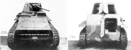 Вариант танка Vickers Mk.E в виде истребителя танков или «танка-охотника» с двумя 37-мм пушками в корпусе - Mark E Alternative A (Mk.E Type C) остался только в проекте – мол, более подробная оценка показала, что при предложенной компоновке установка 37-мм пушек в передней и задней стенке подбашенной коробки, сделает не очень просторный боевой отсек еще более тесным – другими словами, объем внутреннего пространства корпуса танка не позволял размещение двух 37-мм орудий в передней и задней стенке подбашенной коробки. Правда, некоторые считают, что проект предполагал размещение 37-мм орудий в двух разных башнях – т. е., в двухбашенном танке вместо пулеметов должны были появиться 37-мм пушки. Таже есть мнение, что проекта «танка-охотника» вовсе не существовало – в пользу этого выступает отсутствие каких-либо документальных подтверждений проекта (чертежи и т.п.) и утверждение, что британцы не использовали на танках 37-мм орудия. Однако в 1937г. в Италии появился танк Carro di rottura 10T, который создавался с оглядкой на некоторые решения Vickers Mk.E и в этом танке в подбашенной коробке, похожей на развитую подбашенную коробку Mk.E, устанавливалось 37-мм орудие Vickers-Terni L/40. (Рис.374)